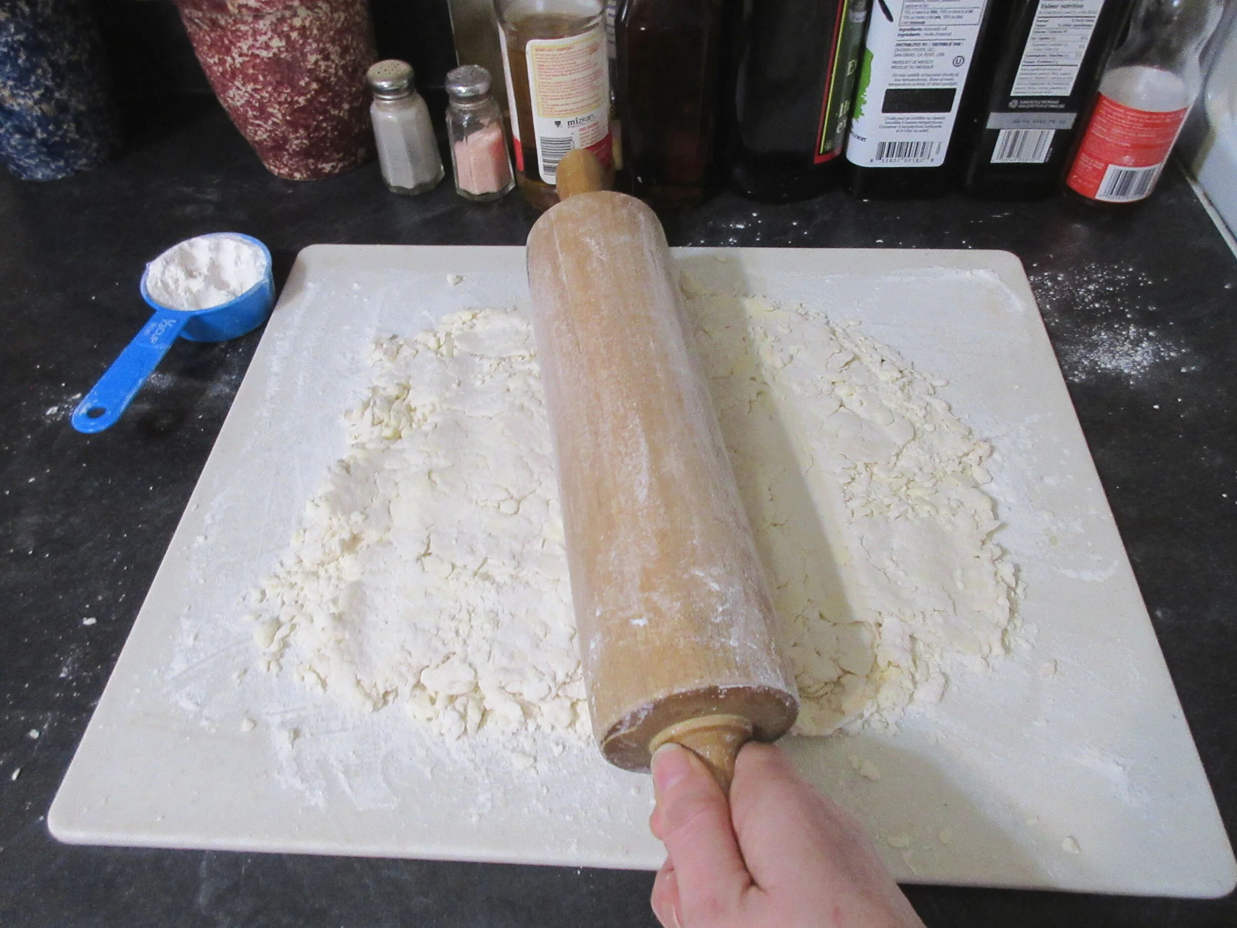 1) Scoop the pastry out of the bowl onto your rolling surface and mound it into a square pile. Hit the pastry with your rolling pin in different directions, then roll it until it is about 1 cm (½”) thick.